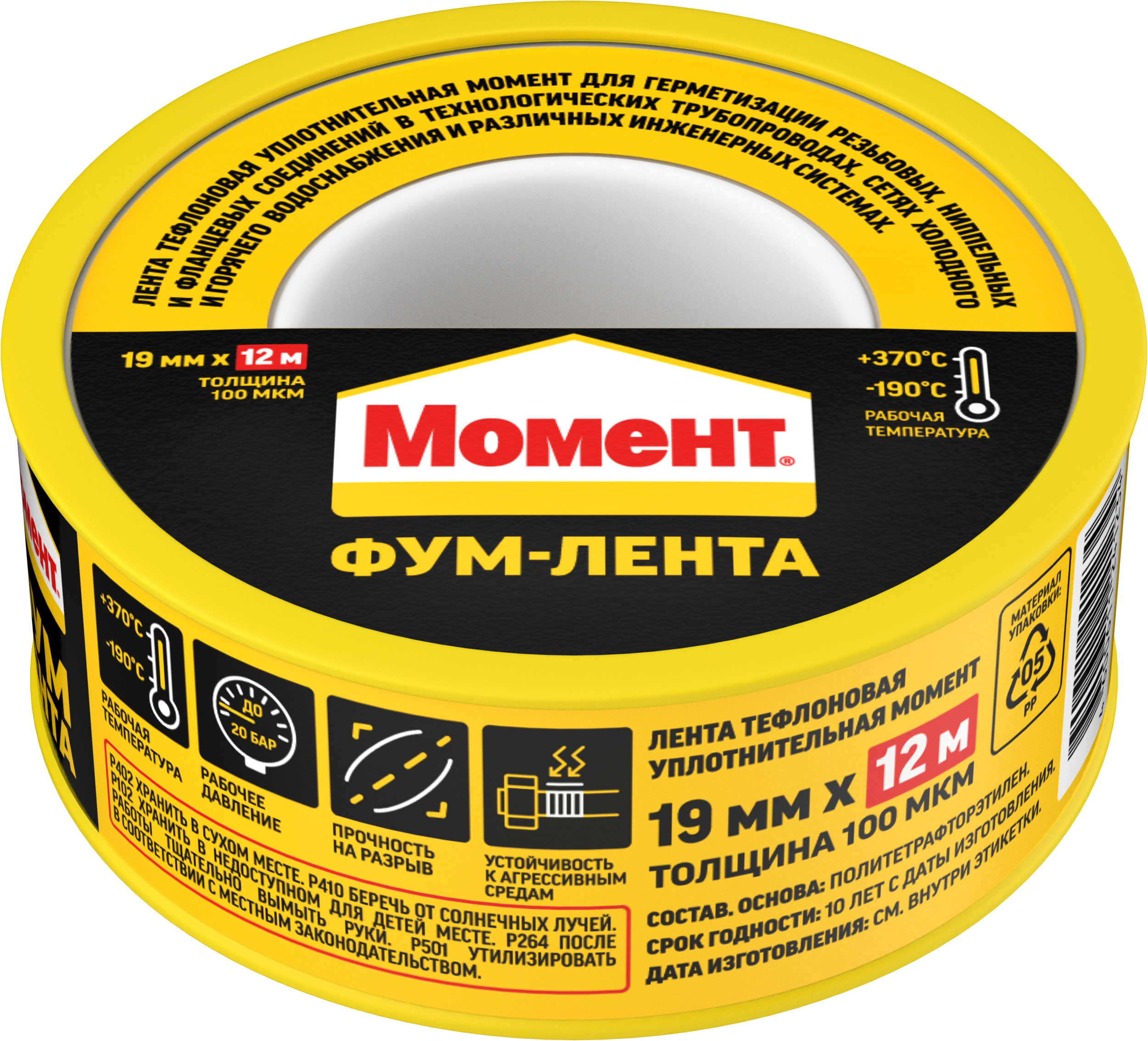 Уплотнительная тефлоновая лента Момент предназначена для быстрой, надёжной и удобной гермитизации труб и резьбовых соединений при рабочей температуре от −190 до +370 градусов.